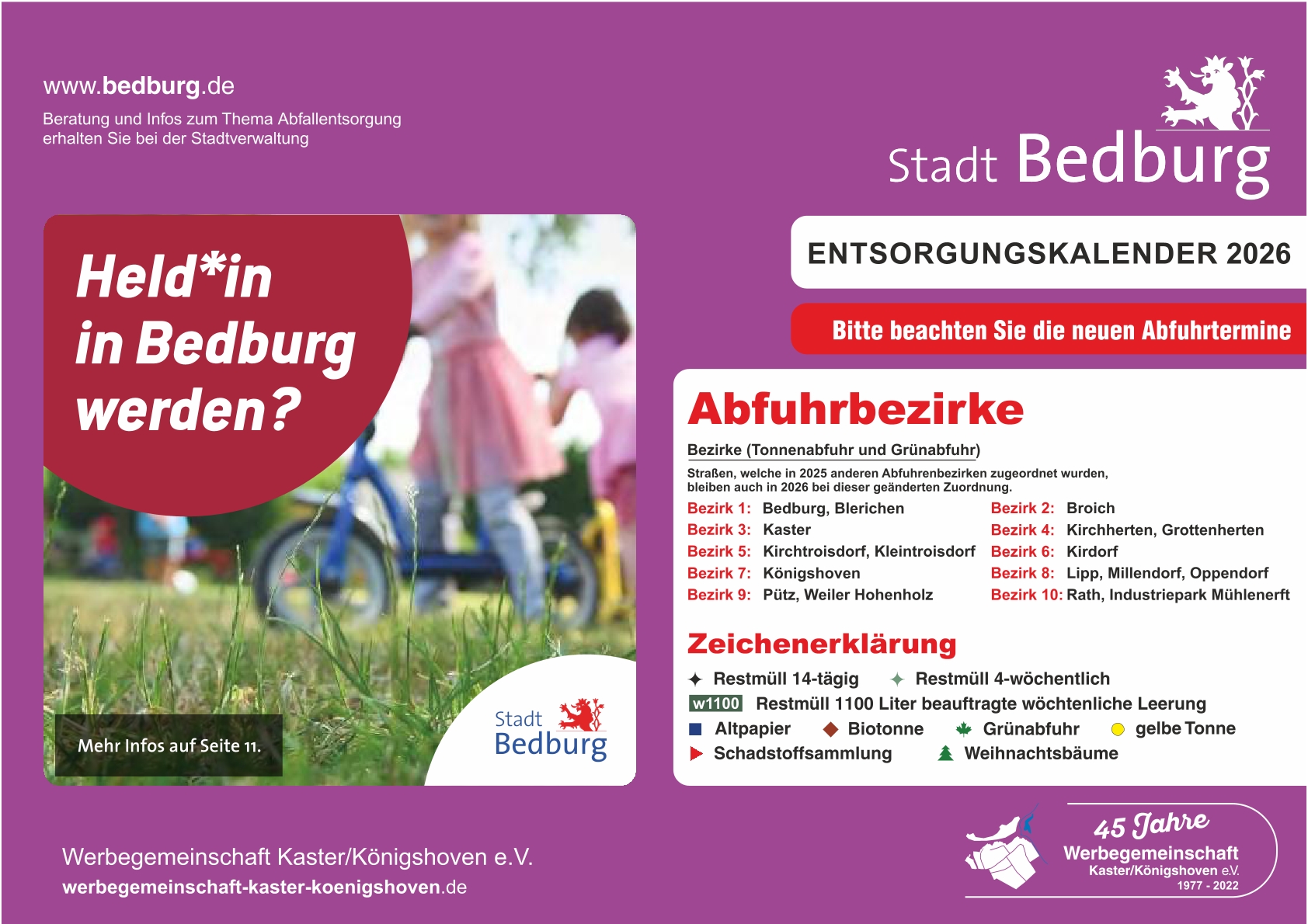 Der Abfallentsorgungskalender für das Jahr 2026 ist da. Ab sofort können Sie sich den neuen Kalender hier herunterladen. Die gedruckte Version wird als Beilage zur Werbepost (Ausgabe 13.-14. Dezember 2025) verteilt und ist ab dem Jahr 2026 zu den üblichen Öffnungszeiten im zentralen Rathaus in Kaster an der Infotheke im Erdgeschoss erhältlich.