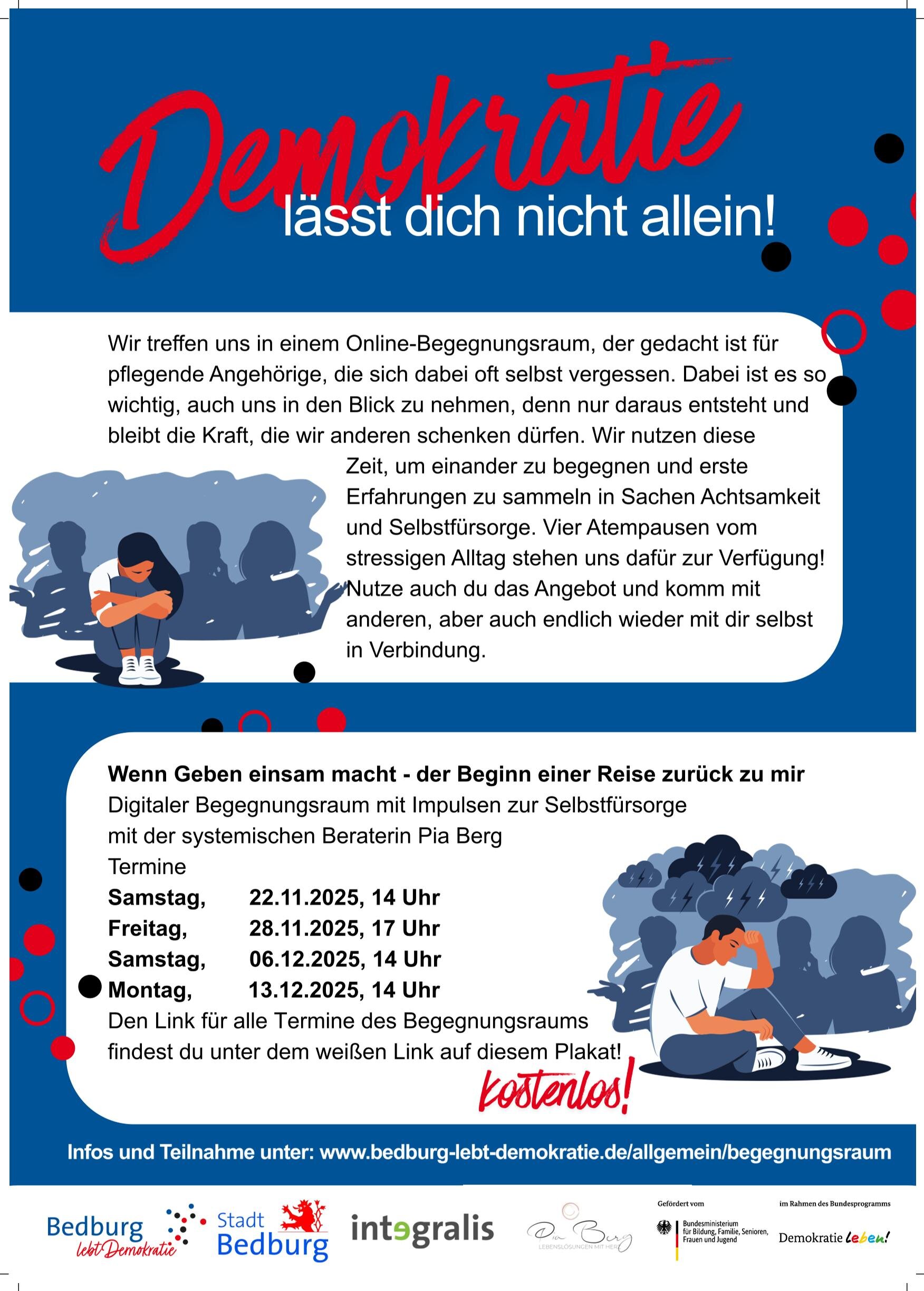 Alle Termine anzeigenWir treffen uns in einem Online-Begegnungsraum, der gedacht ist für pflegende Angehörige, die sich dabei oft selbst vergessen. Dabei ist es so wichtig, auch uns in den Blick zu nehmen, denn nur daraus entsteht und bleibt die Kraft, die wir anderen schenken dürfen. Wir nutzen diese Zeit, um einander zu begegnen und erste Erfahrungen zu sammeln in Sachen Achtsamkeit und Selbstfürsorge. Vier Atempausen vom stressigen Alltag stehen uns dafür zur Verfügung! Nutze auch du das Angebot und komm mit anderen, aber auch endlich wieder mit dir selbst in Verbindung.