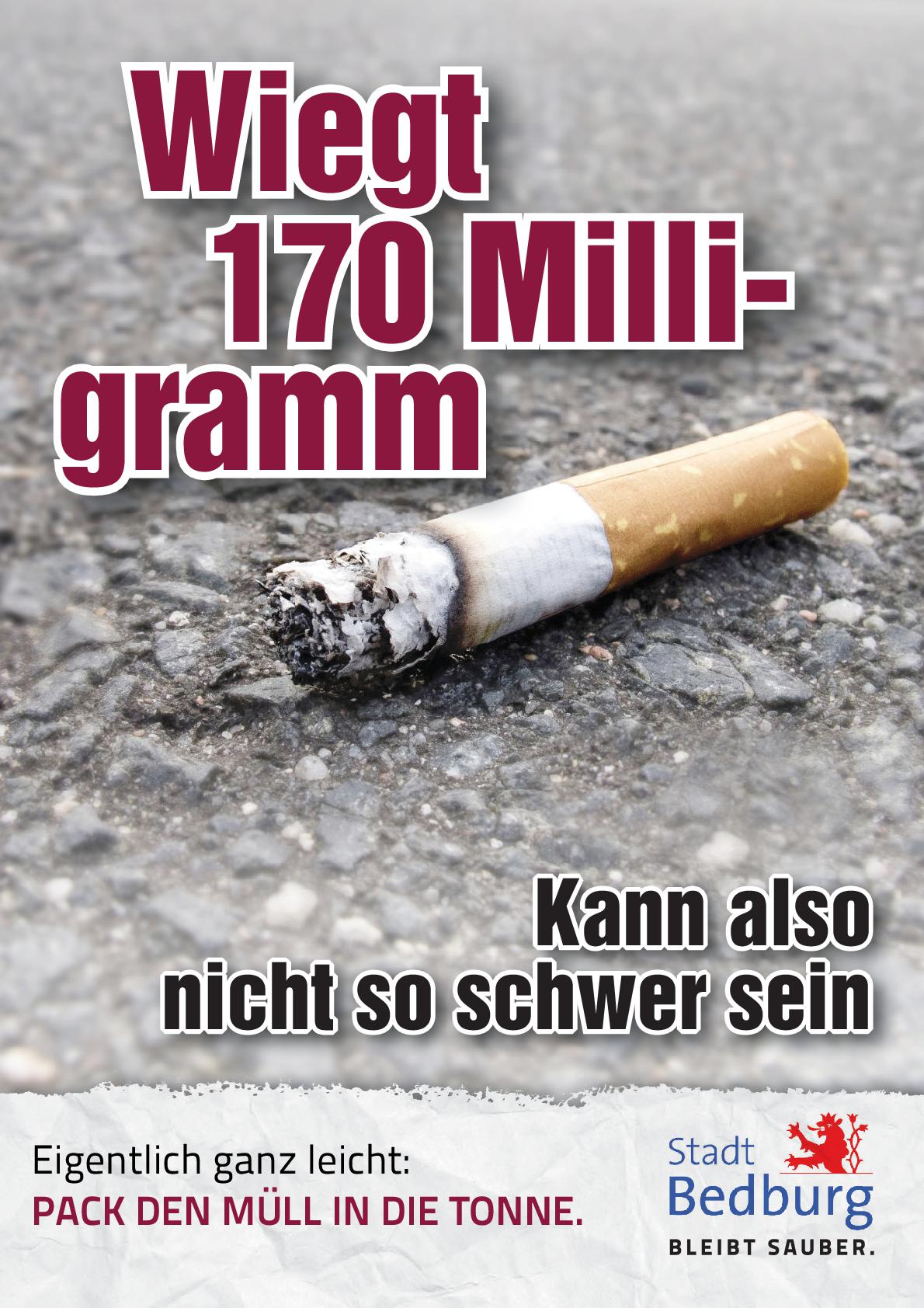 Die Stadt Bedburg verschärft ihr Vorgehen gegen das achtlose Wegwerfen von Abfällen im öffentlichen Raum: Das Verwarngeld für das Wegwerfen oder Zurücklassen von Unrat, Lebensmittelresten sowie insbesondere Zigarettenkippen soll von bislang 25 Euro auf 55 Euro angehoben werden. Damit soll der im Ordnungsbehördengesetz vorgesehene Höchstsatz ausgeschöpft werden.