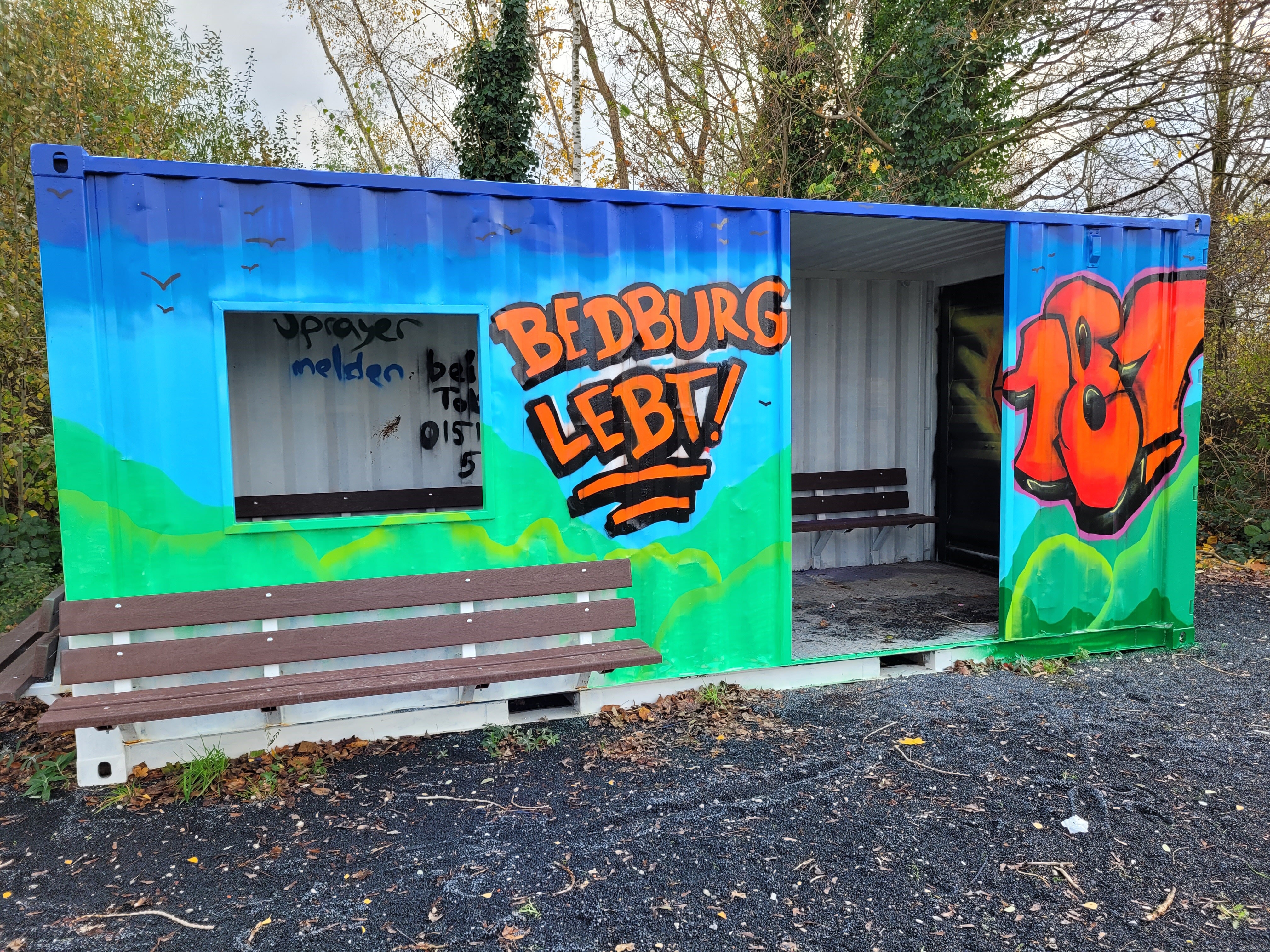 Einigen ist er vielleicht schon aufgefallen, der bunt besprühte Container am Bedburger Bahnhof gegenüber des Netto-Marktes. Der Container ist Zentrum eines Platzes, der ab sofort der Jugend gehört. Gemeinsam mit der Jugendförderung der Stadt Bedburg, der RheinFlanke und einem Bedburger Künstler können Kinder und Jugendliche diesen Platz nach eigenen Wünschen gestalten.