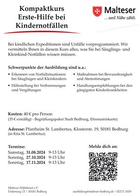 Die Kurse finden am Sonntag, den 27. Oktober und am Sonntag, 17. November, jeweils von 9:00 Uhr bis 13:00 Uhr statt. Die Teilnahmegebühr beträgt 40 Euro, eine Ermäßigung ist mit dem Begrüßungspaket der Stadt Bedburg sowie der Ehrenamtskarte möglich. Die Anmeldung erfolgt über die Homepage der Malteser.