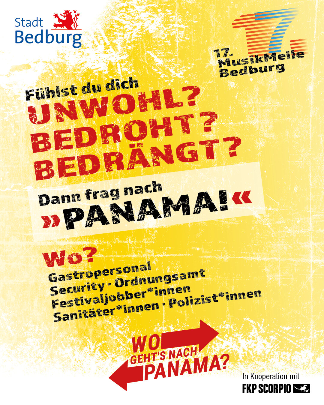 Um den Besucherinnen und Besuchern der 17. Bedburger MusikMeile am 7. September möglichst einfach und unkompliziert Hilfe anzubieten, beteiligt sich das Musik-Festival auch in diesem Jahr wieder an dem Projekt „Wo geht’s nach Panama?“. Mit dieser Frage erhalten Gäste auf dem Festival-Gelände sofort Hilfe, wenn sie sich unwohl oder bedrängt fühlen.