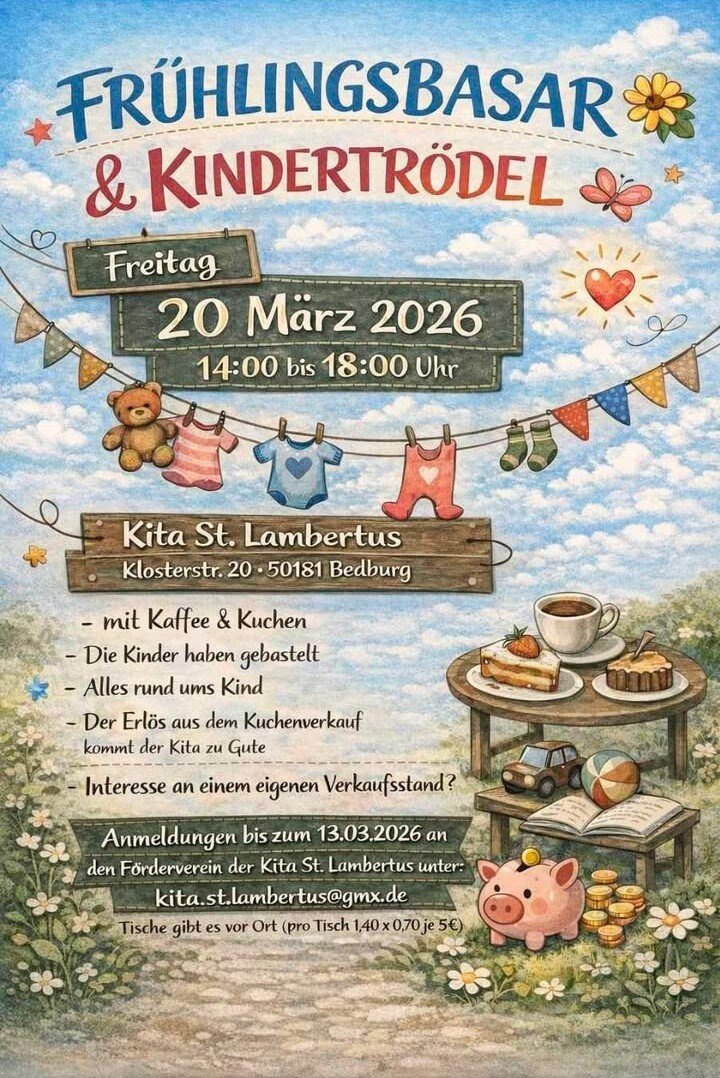 Anmeldungen bis zum 13.03.2026 an den Förderverein der Kita St. Lambertus unter: kita.st.lambertus@gmx.de