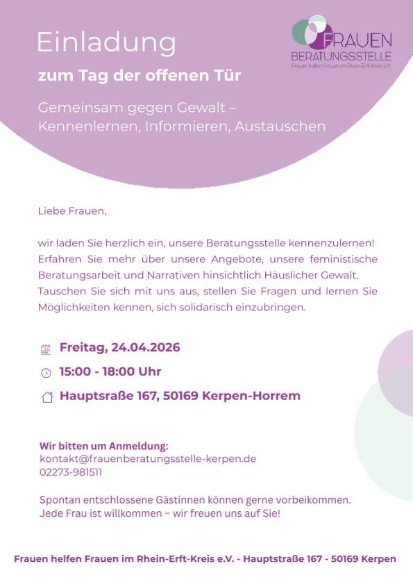 Die Frauenberatungsstelle lädt am Freitag, dem 24. April von 15 Uhr bis 18 Uhr ein, die Beratungsstelle kennenzulernen! Erfahren Sie mehr über die Angebote, die feministische Beratungsarbeit der Beratungsstelle und Narrativen hinsichtlich Häuslicher Gewalt. Tauschen Sie sich aus, stellen Sie Fragen und lernen Sie Möglichkeiten kennen, sich solidarisch einzubringen.