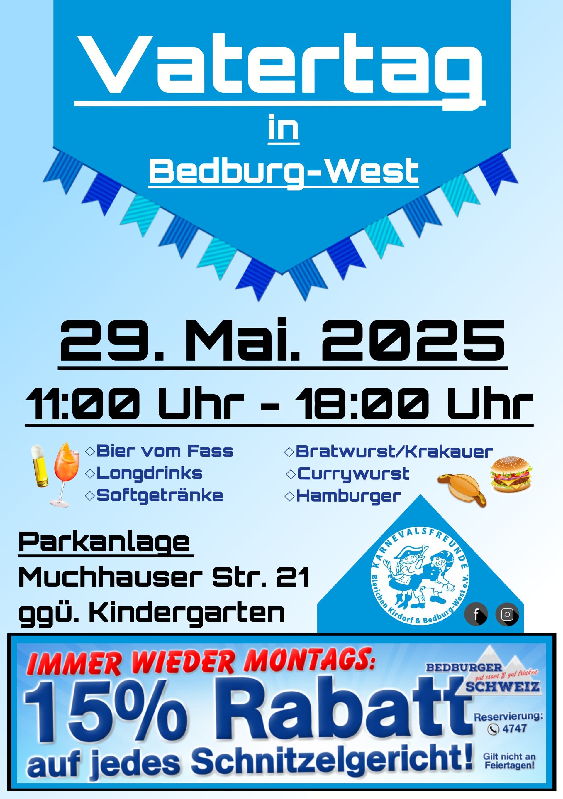 Die Karnevalsfreunde Blerichen Kirdorf Bedburg-West laden alle Väter und Familien sowie Freunde ab 11 Uhr zu einem gemütlichen Vatertag an der Parkanlage Muchhauser Str. in Bedburg-West ein.