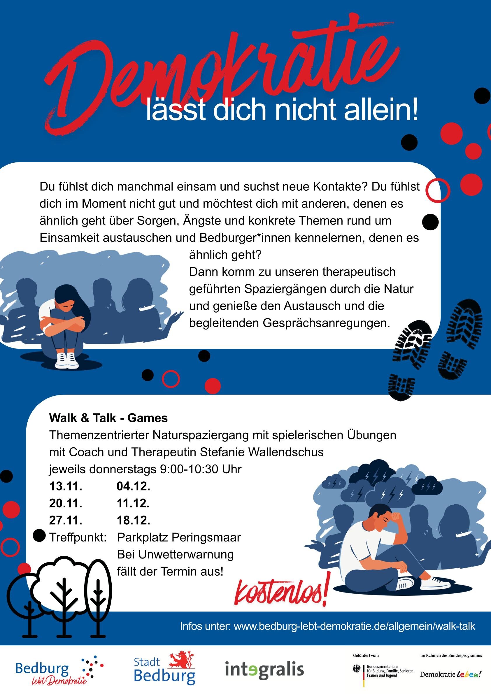 Alle Termine anzeigenDu fühlst dich manchmal einsam und suchst neue Kontakte? Du fühlst dich im Moment nicht gut und möchtest dich mit anderen, denen es ähnlich geht über Sorgen, Ängste und konkrete Themen rund um Einsamkeit austauschen und Bedburger*innen kennelernen, denen es ähnlich geht? Dann komm zu unseren therapeutisch geführten Spaziergängen durch die Natur und genieße den Austausch und die begleitenden Gesprächsanregungen.