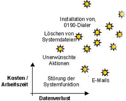 Gefährlich werden Viren, wenn sie sich unbemerkt einschleichen und z.B. wochen- oder monatelang unbemerkt das System und das lokale Netz nach internen Informationen ausspionieren. Aber auch dagegen kann man sich schützen.